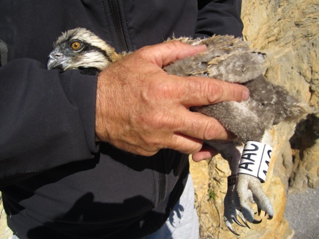 Le Parc National d’Al Hoceima (Figure 1) est classé comme une zone bioclimatique méditerranéenne semi-aride à aride située sur la côte nord du Maroc (Al Hoceima, 42 ° 39 ‘N, 11 ° 05′ E). Il se compose d’une zone marine et une terrestre de 19 600 ha et 28 400 ha, respectivement. La zone protégée qui fait plus de 40 km de côtes le long de la mer Méditerranée de Cala Iris à Al Hoceima, est caractérisée par de hautes falaises calcaires, des grottes marines et des petits îlots rocheux à proximité de la mer, qui pour la plupart appartiennent à des territoires espagnols (par exemple Peñón de Vélez de la Gomera). La faune de poissons est particulièrement riche et comprend aussi bien des espèces méditerranéennes qu’atlantiques qui entrent par le détroit de Gibraltar à proximité (Nibani 2010). Certaines de ces espèces représentent une bonne proie potentielle pour les balbuzards pêcheurs, qui nichent sur les pinacles rocheux le long de la côte de la mer (Thibault et al., 1996). Méthodes de recensement Les enquêtes précédentes relatives à la période 1983-1990 ont été réalisées uniquement par des observations lointaines, en utilisant des bateaux en mer ou une longue-vue de la terre. La position de chaque nid a été enregistrée sur une carte géographique et des photos ont été prises pour une meilleure identification (Hodgkin et Beaubrun, 1990). Les nids ont été considérés comme occupés selon le comportement des balbuzards pêcheurs, à savoir la présence d’individus dans le nid ou dans ses environs et cela lorsque le contenu du nid n’était pas visible du tout à distance. Dans d’autres cas, les nids ont été considérés comme des logements inoccupés si rien n’a été détecté dans le nid ou si aucun balbuzard n’a été observé dans le voisinage de celui-ci, les nids ont été considérés comme indéterminés quand aucune information n’était disponible. Le recensement de 2012-2013 a eu lieu en mai (comme en 1983-1990), au moment où la plupart des balbuzards pêcheurs reproducteurs élèvent leurs poussins. Une équipe de cinq observateurs, menés par JMD qui a 30 ans d’expérience en observation de balbuzards en Méditerranée, a participé à la mission. Le travail de terrain est composé de 4 jours d’observations chaque année à partir de la terre et 4 jours de relevés côtiers en mer. Les nids de Balbuzards ont été cherchés le long des falaises côtières au cours des enquêtes au moyen de bateaux de pêcheurs locaux, et le contenu des nids ont d’abord été contrôlés à distance, de la terre, à l’aide de longue vue. Depuis, nous avons couvert l’ensemble 40 km de côte inclus dans la zone protégée, tous les territoires occupés par des balbuzards pêcheurs ont été scrutés. Un nid a été considéré comme actif si au moins un œuf y’a été posé. Afin d’éviter les risques d’erreurs dans le comptage des œufs et des poussins, le nid et son contenu de nidification ont été validés par l’escalade des falaises rocheuses à proximité des nids. La présence du balbuzard et le nombre d’œufs et de poussins ont donc été évalués sans équivoque. Les nouveau-nés ont été mesurés, pesés et individuellement marquées par une bague métallique (CRBPO-MNHN, Paris) et une bague de couleur blanche avec un code à trois lettres (pour l’identification à longue distance).