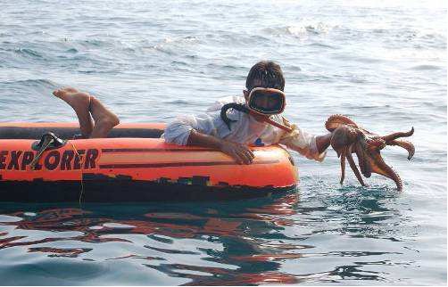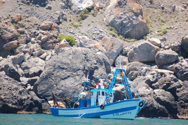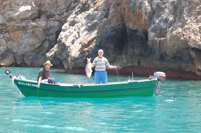 (2) La pêche à la dynamite est couramment utilisée dans PNAH (Nibani 2010). La pêche à la dynamite commence par des hommes qui s’assoient sur des falaises verticales à la recherche d’un banc de poissons (Nibani 2010). La dynamite est jeté de la falaise afin de tuer les poissons, qui viennent à la surface de la mer et sont recueillis par un nageur. On estime le nombre de personnes qui utilisent régulièrement cette technique illégale dans le PNAH : de 10 à 15 personnes, principalement dans le voisinage des villages d’Al Hoceima et Bades, ils arrivent à en extraire 367 tonnes de poissons par an (Nibani 2010). En 2013 (pendant 4 j de campagnes en mer), nous avons constaté la présence de pêcheurs à la dynamite dans deux cas différents. (3) la pêche en utilisant la sulfate de cuivre pour le poulpe Octopus vulgaris est couramment utilisé par au moins 15 pêcheurs locaux (chiffres selon Nibani 2010). Les pêcheurs observent l’eau d’un bateau pneumatique se déplaçant lentement sur la surface de la mer jusqu’à ce qu’une pieuvre soit détectée. Ils forcent ensuite le poulpe à sortir de son trou à l’aide de propagation sulfate de cuivre à la surface. Bien que cette pêche se concentre sur une seule espèce, le sulfate se propage rapidement, empoisonnant les organismes marins dans les environs.