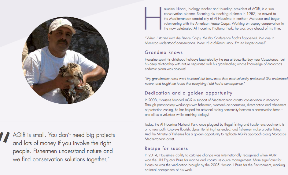 L’association AGIR mène une campagne de nettoyage des filets de pêche abandonnés au sein du Parc National d’AlHoceima ; Ces filets abandonnés constituent un grand danger ; car en plus de son pouvoir de pêche des poissons ; ces filets constituent aussi un grand danger pour les oiseaux marins et tortues marines ; cette campagne se fait aussi auprès des pecheurs pour les sensibiliser sur l’impact de ces filets sur la biodiversité marine ; ainsi que la récolte de données pour évaluer cet impact ; et programmer un plan d’action pour contribuer à sa réduction ; à travers des activités de recycle au sein du programme d’Évaluation nationale des engins de pêche abandonnés / perdus ( Une contribution à la mise en œuvre du PAM / PNUE Plan régional sur la gestion des déchets marins dans la Méditerranée )