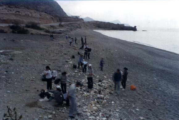 - Chaque groupe marchera le long de la coupe ; et une personne rassemblera les ordures pendant que l’autre étudiant enregistre ce qui est rassemblé. Ayez les étudiants rassemblés et enregistrez toutes les ordures et mesuré la distance de la ligne centrale. Quelques groupes devraient échantillonner la région de la marée haute, autres la région de la mi-marée, et autres la région de la marée basse. faites les observer comment les ordures s’accumulent. Par exemple, quelques parties de la plage peuvent avoir plus de débris que d’autres régions. Ce pourrait être dû à beaucoup de facteurs, tel que courants, direction des vents, tempêtes, modèle d’usage de plage, et proximité de sources de la pollution terre basée. Les étudiants peuvent remarquer aussi ces débris s’accumuler aux différents niveaux de la marée .