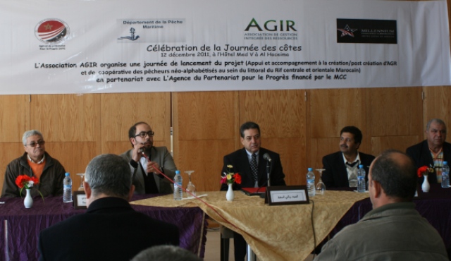 Le Lancement du projet d’ appui et d’accompagnement à la création/post réation d’AGR et de coopérative des pêcheurs néoalphabétisés au sein du littoral du Rif centrale et orientale Marocain organisé par l’Association AGIR de Gestion Intégrée des Ressources , financé par l’APP à travers le Millenium Challenge a tenu lieu à l’Hôtel Mohamed V le 12 décembre 2011 à AL Hoceima , La journée a commencé par un mot d’ouverture de M. le Wali de la région Taza Al Hoceima Taounate et Guersif,